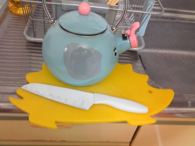 ちょっと、みづらいけど、ぞうさんケトルに、ハリーのまな板、そしておしゃれ包丁です!